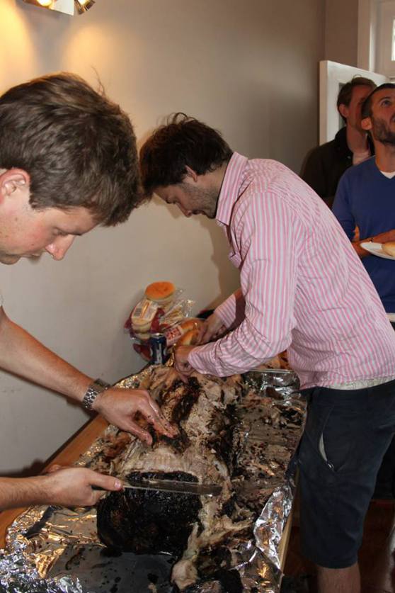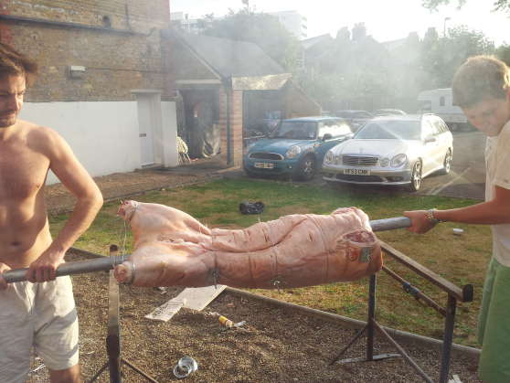 The pig was fully primed, we had a fat drip, there was ample booze, Laura was on apple sauce duty, there was lamb for non-piggers, it only promised to shower occasionally etc etc. But I couldn’t shake a feeling of apprehension. We had one-hundred people due round for food at 3.30 pm and a completely raw pig spread eagle of Skinny’s lounge floor, violated by a scaffolding pole. Aside from the responsibility, I think a big part of the nerves was wanting to do the pig itself justice and cook it properly.