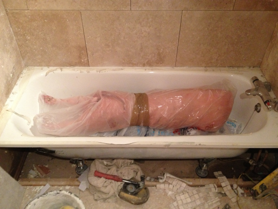 The pig (a Gloucester Old Spot) was sourced from a great little place called Keythorpe Valley Farm in Leicester. Due to a slight miscommunication, the old fella was slaughtered a week early. This was fine at first as it could be kept on the farm in the fridge for five days. However, it then had to be released to us a day early which resulted in an overnight stay in Skinny’s bath tub (below).