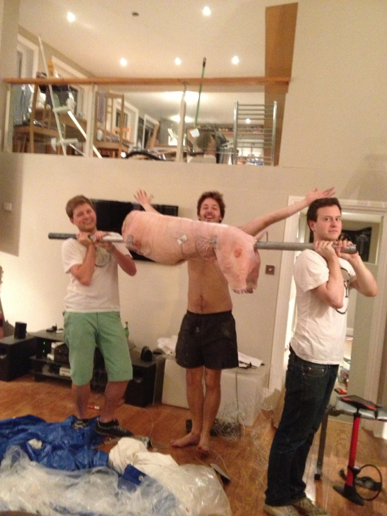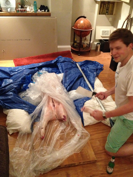 It was to this soundtrack, which reminded me of the True Blood theme song on crack, that we proceeded to hammer in our (sanded and sterilised) scaffolding pole into the pig. I literally mean hammered with a sledgehammer. The hole wasn’t big enough. Picture that if you will and listen to Seasick Steve and you’re someway there.